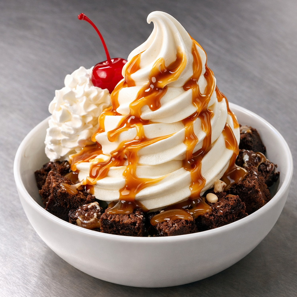 Two warm brownies topped with your choice of vanilla, chocolate, or swirl soft serve ice cream, hot fudge, hot caramel, whipped topping, and a cherry.